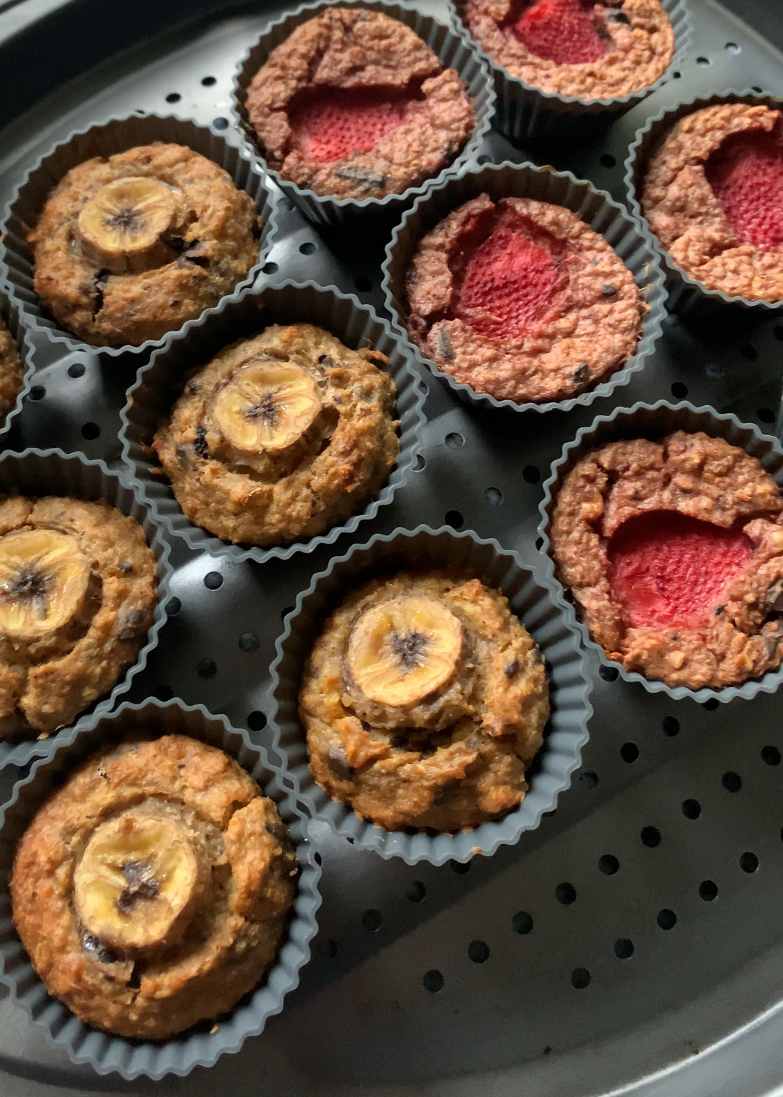 First of all, I put all the ingredients together into my mixer namely: One banana, one egg, oatmeal, two yogurts and finally the baking powder.